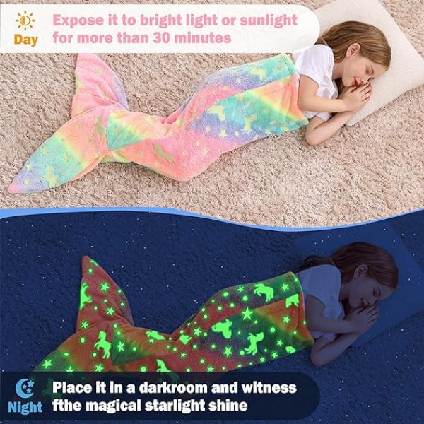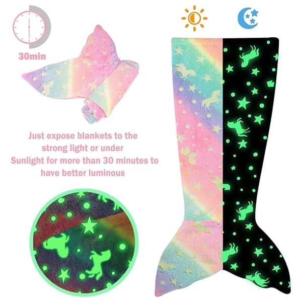 Táto príjemná detská deka s chvostom morskej panny po dopade svetla svieti v tme!