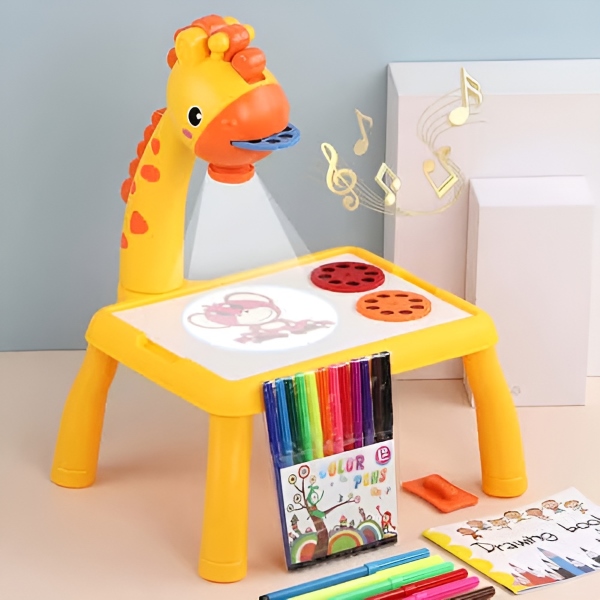 Farebný projektor s motívom žirafy navrhnutý tak, aby zaujal deti a podporoval rozvoj motoriky a kognitívnych schopností.